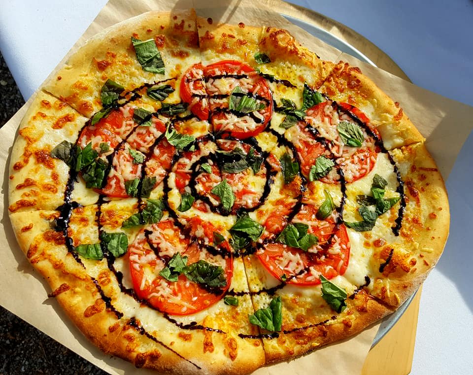 - Margherita – Garlic olive oil with tomato and mozzarella, finished with fresh basil and balsamic drizzle